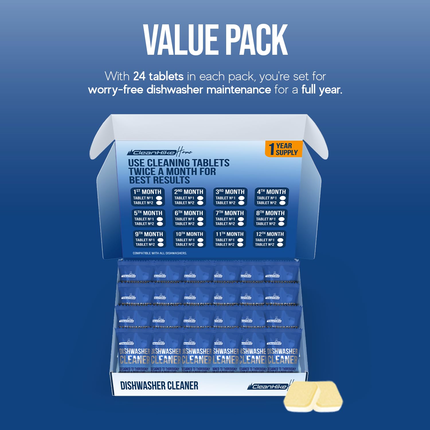 Monthly Upkeep Solution - Use one or two tablets per month for optimal results. Simply run a cycle to restore your dishwasher.