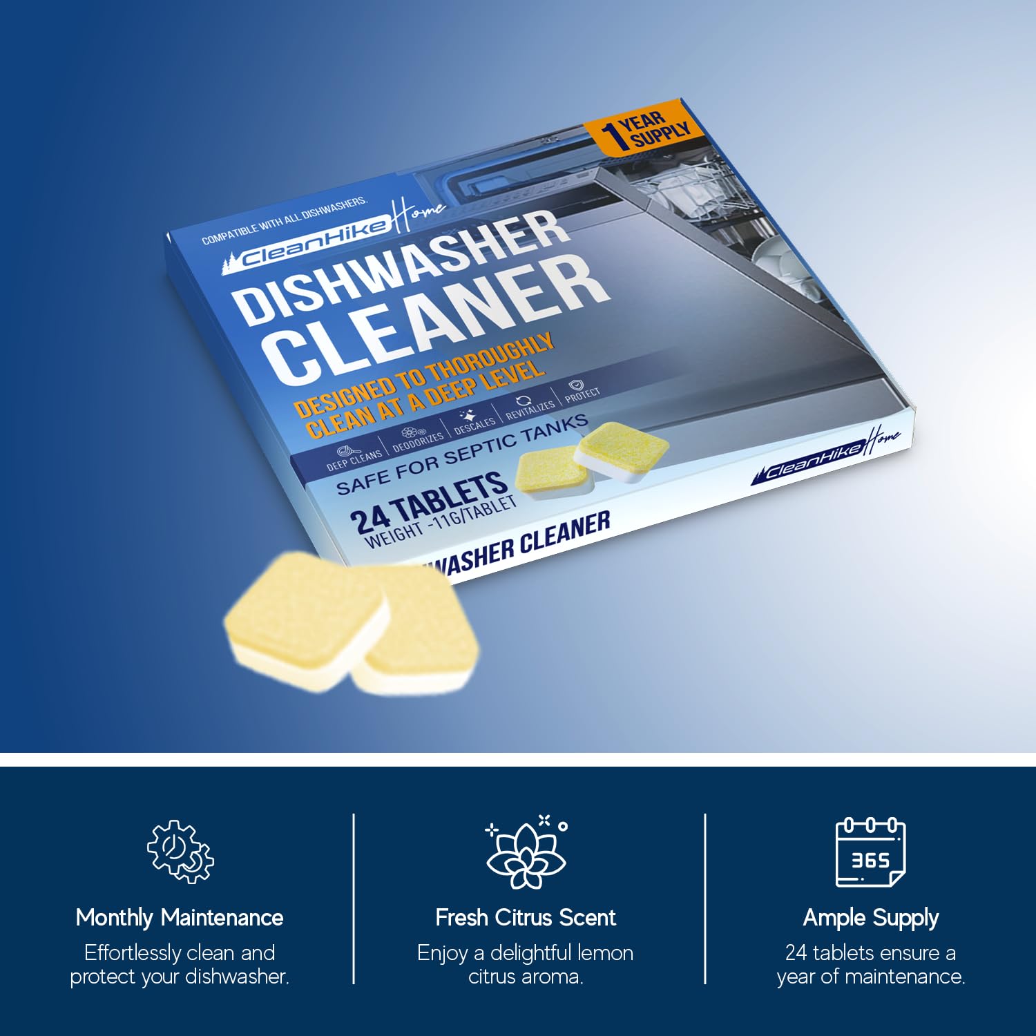 Dual-Action Odor Cleanser - Experience a refreshing transformation in your dishwasher's scent. Our dual-action booster tablet, infused with zesty lemon citrus fragrance, not only revitalizes the dishwasher's aroma but also enhances its appearance.